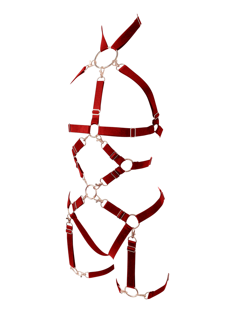 Shibari inspired satin elastic straps wrap your body, joined with rose gold lobster claw claps and hardware.